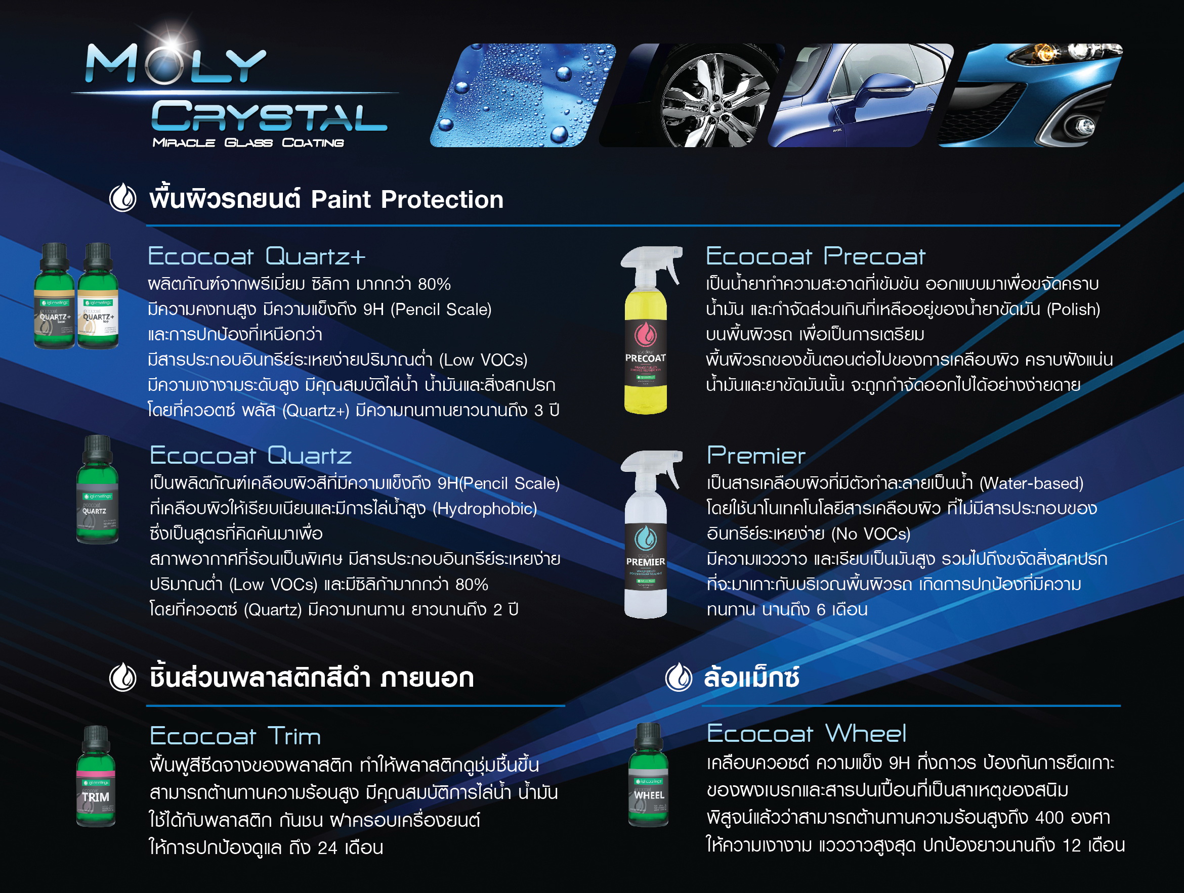 เคลือบแก้ว เซรามิค โมลีคริสตัลเป็นการนำนวัตกรรมใหม่ล่าสุดจากประเทศญี่ปุ่น ภายใต้ลิขสิทธิ์เพียงผู้เดียวในประเทศไทย โมลีคริสตัลเป็นการเคลือบสีระดับสูงในรูปแบบฟิล์ม Inorganic ได้ผ่านการทดสอบจากสถาบัน The Japanese Industrial Standards (JIS) ด้วยวิธีการทดสอบค่าความแข็งของสีผิวรถยนต์ หลังจากมีการเคลือบน้ำยาโมลีคริสตัล โดยน้ำยาโมลีคริสตัลสามารถเพิ่มความแข็งแกร่งของสีผิวรถได้ถึง 6H ซึ่งเป็นระดับความแข็ง หรือ Hardness ที่เหมาะสมที่สุดสำหรับบริเวณผิวสีรถยนต์